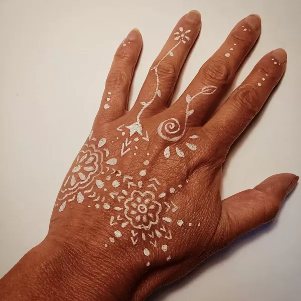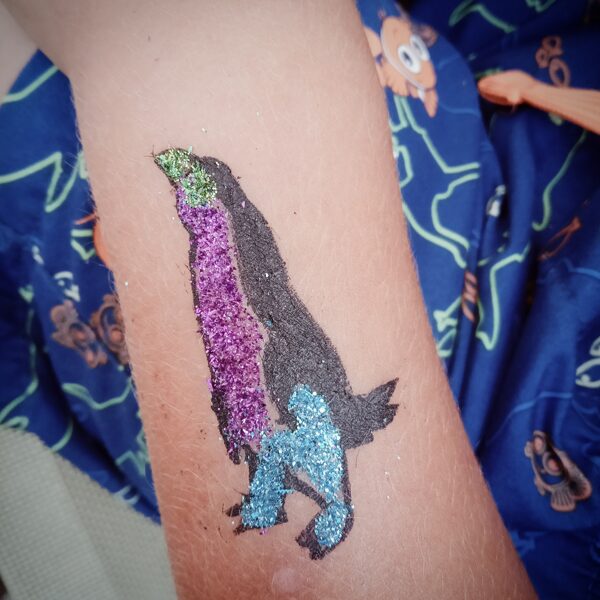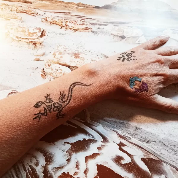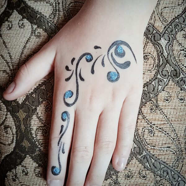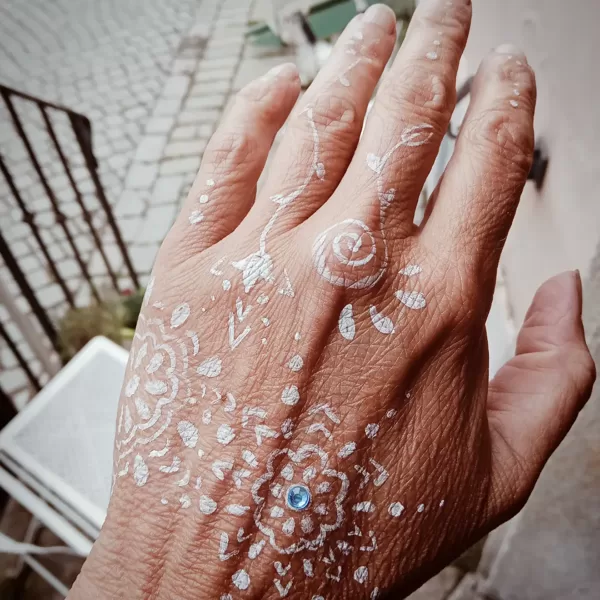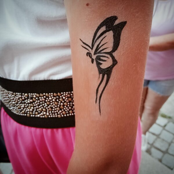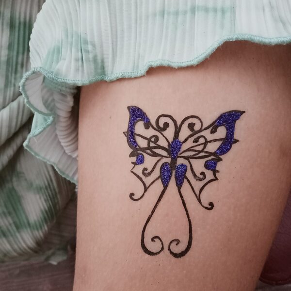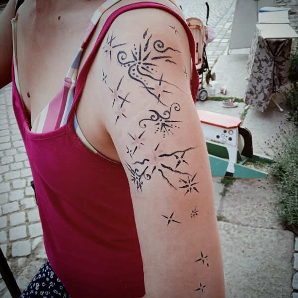 Ke zdobení těla a dočasnému tetování používáme kosmetické tělové inkousty (po domluvě lze i hennu nebo jaguu), kosmetické třpytky a flitry, které na kůži vydrží i několik dní.